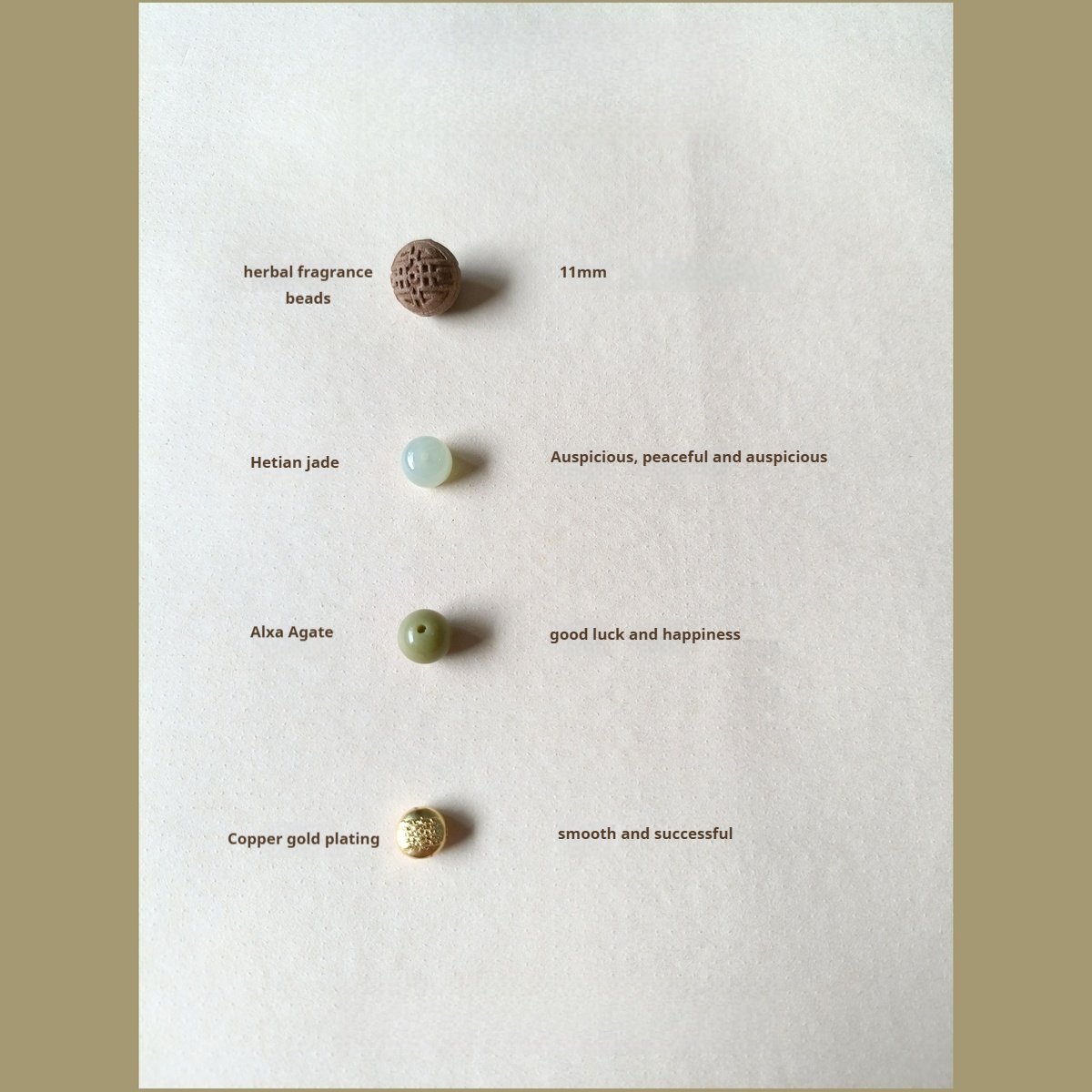 This handcrafted bracelet blends Hetian jade, Alxa agate, and hand-carved herbal aromatherapy beads—crafted from meticulously ground traditional Chinese herbs.